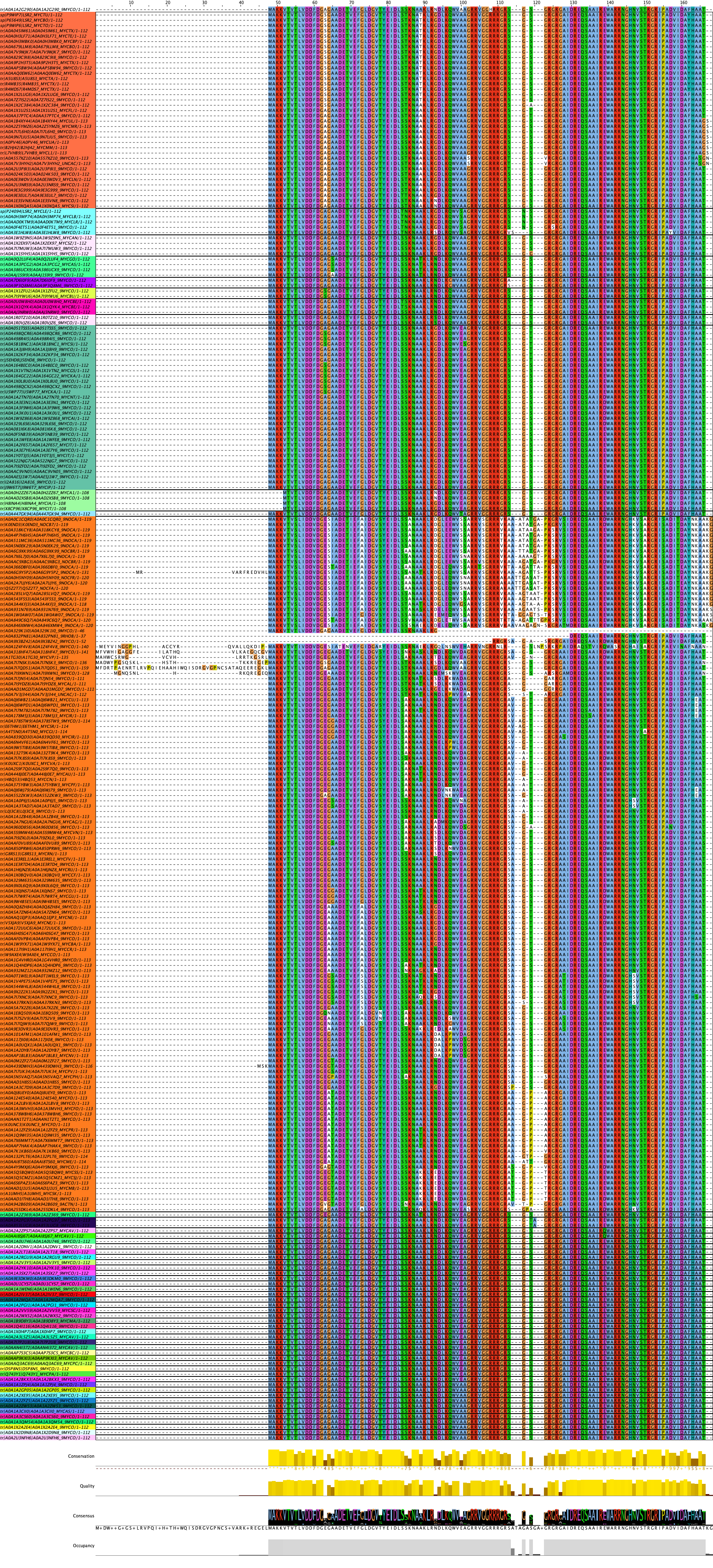 We can see the full length of the sequence and that similar residues are aligned vertically, in Figure 4 (a). We can see any insertions/deletions for specific sequences visually. The extent of conservation, and a consensus sequence, can be seen below the alignment. We can colour the alignment to highlight aspects of the biology/biochemistry: