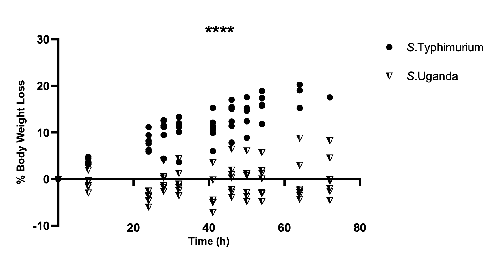 Figure 1 shows the percentage of weight loss relative to a baseline weight (here, weight measured at 0 hours post infection), but the y-axis label and orientation is poorly chosen.