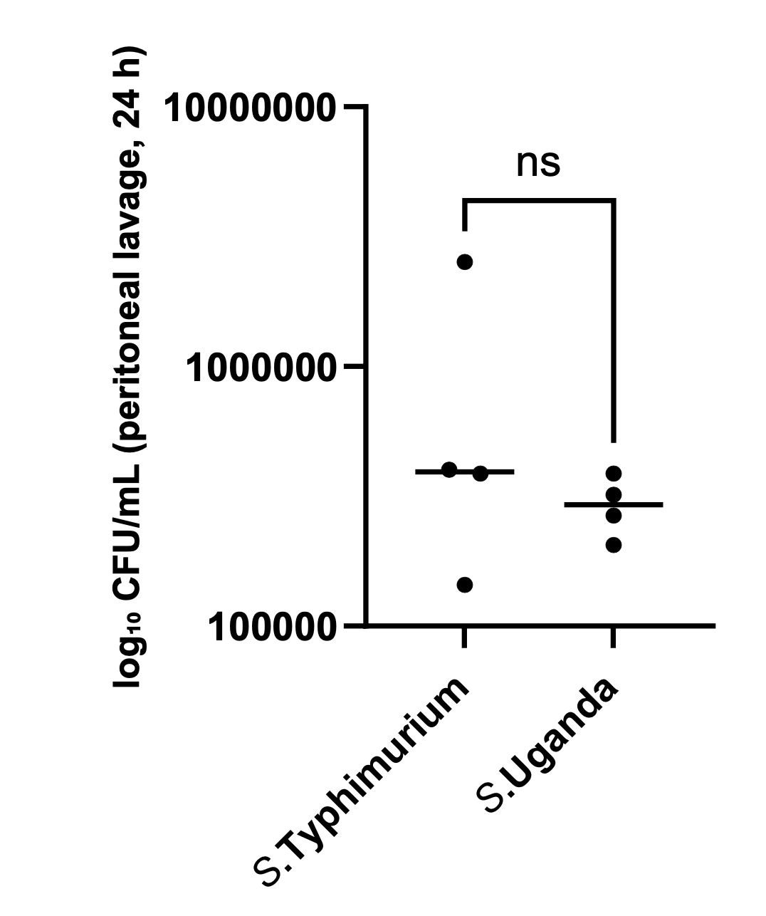 Figure 2 shows counts of bacteria in peritoneal lavage, 24h post infection. Bacterial counts are typically found as counts of colony-forming units (CFU). Because these counts are large numbers and bacterial growth is exponential, they are often presented as log(CFU). So, if \(\textrm{CFU} = 100000 = 10^5\), \(\log_{10}{\textrm{(CFU)}} = 5\).