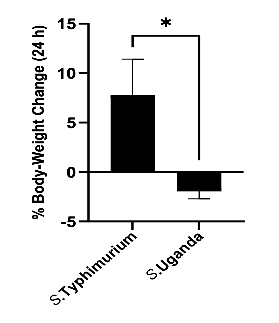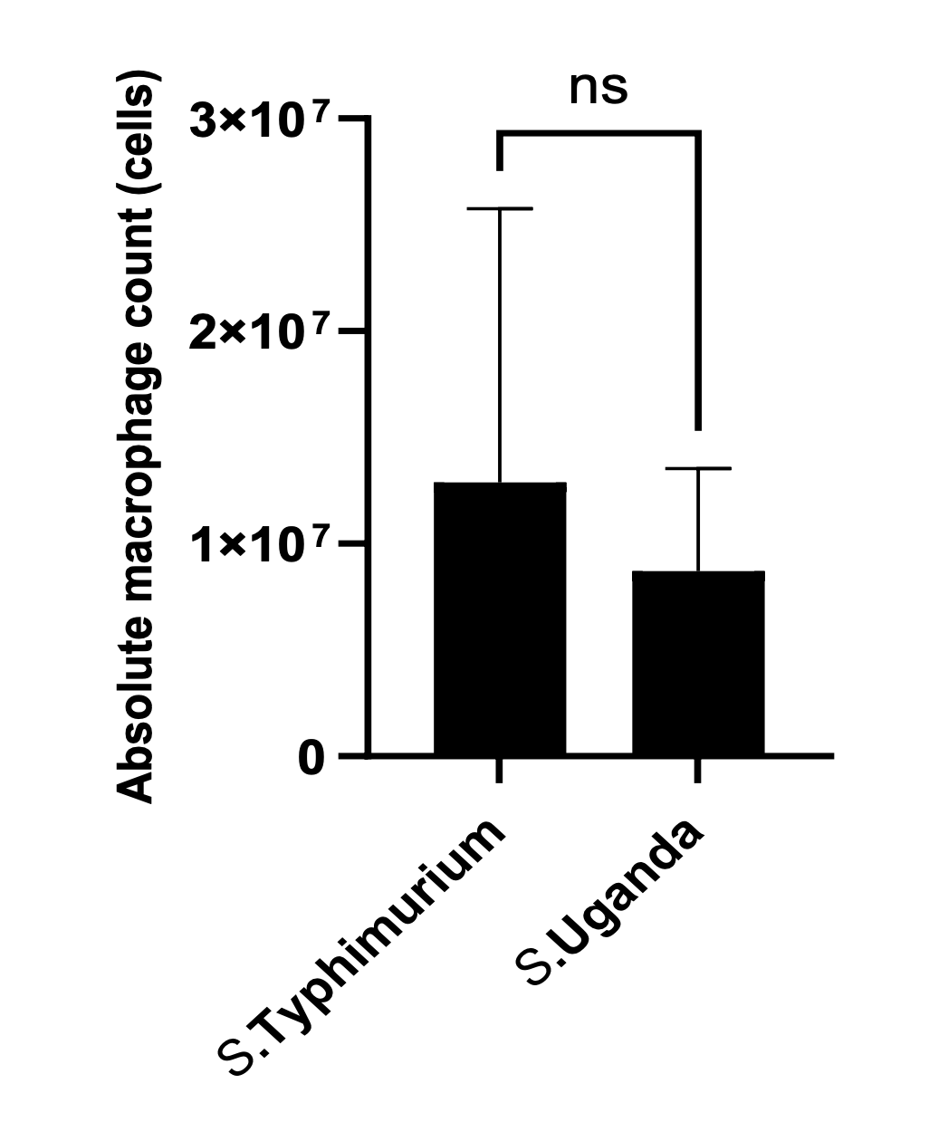 The Figure 4 error bar for S. Typhimurium only extends vertically above the mean absolute macrophage count. This is a “dynamite plot” and undesirable because it is not truly representing the (here, presumed to be SEM) actual estimate of error. But in this case it is also disguising a much more significant statistical error.
